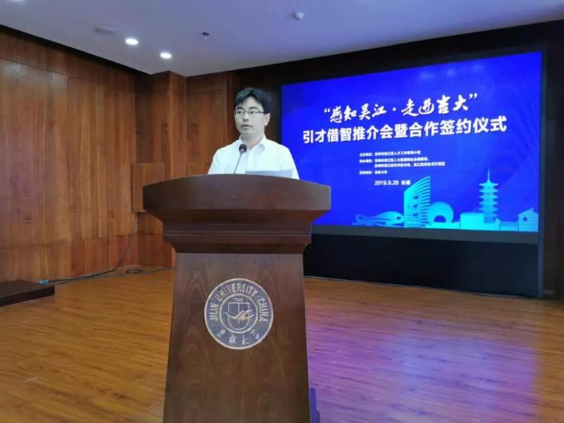 在引才借智推介会上,吉林大学党委常委、副校长王玉柱致辞,鼓励吉大学子赴吴江就业,乐居吴江。