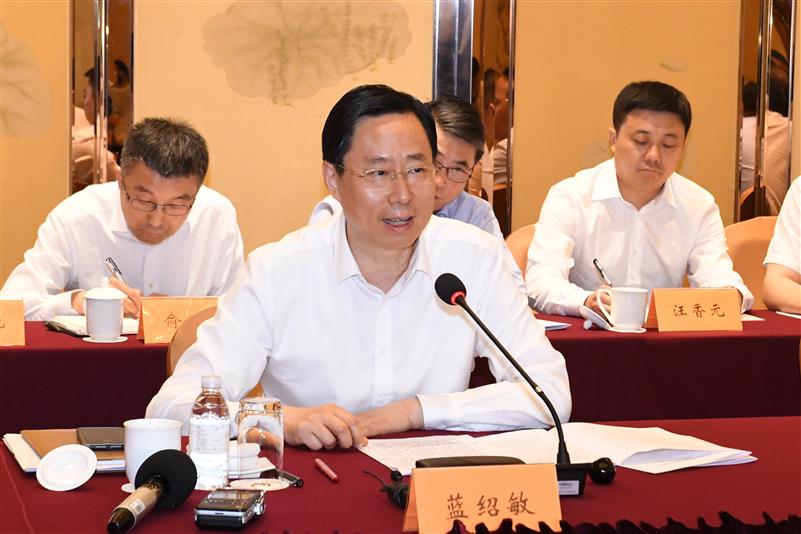 在认真听取吴江区委书记王庆华关于吴江区经济社会发展情况汇报后,蓝绍敏对吴江区近年来各项工作取得的成绩给予充分肯定。蓝绍敏指出,吴江区生态底子好,受中美经贸摩擦影响小,民营经济实力强,特别是被纳入长三角生态绿色一体化发展示范区后,迎来了宝贵的发展机遇。要用一体化的意识、一盘棋的思想推动高质量发展;要用创新的思路、改革的办法来实现一体化的示范;要用新发展理念、新协作模式来实现生态保护和绿色发展的统筹。在融入长三角一体化发展中,要着力消除“老调重弹”的思想误区,站在“两个维护”的高度来认识和推动,把落实国家战略真正变成政治自觉、思想自觉、行动自觉;要摒弃“被动等待”心态,主动谋划、积极作为,抢抓历史性发展机遇;要克服“合作吃亏”的顾虑,算大账、长远账,辩证看待“虹吸效应”和“溢出效应”。要真正沉下心来多做研究性、探索性、开创性工作,高标准高质量落实好国家战略、建设好示范区,全力以赴做好融入长三角一体化这篇大文章。