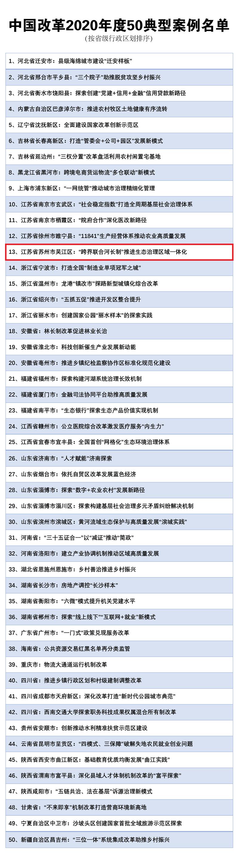 中央深改委第十六次会议指出,基层是改革创新的源头活水,要注重激发基层的改革创新活力,支持开展差别化创新。为助力新时代地方改革再出发,促进形成新发展阶段地方改革新局面,12月10日,中国经济体制改革杂志社主办的“中国改革2020年度案例征集”活动发布50个典型案例名单。吴江“‘跨界联合河长制’推进生态区域治理一体化”案例名列其中。