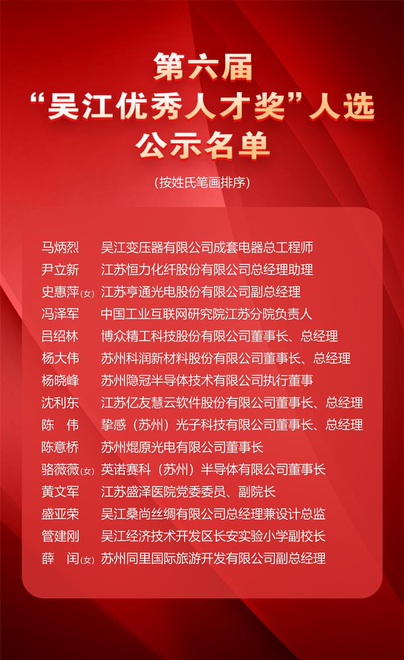 为广泛听取意见、接受社会监督,经区委人才工作领导小组会议研究决定,对15名第六届“吴江优秀人才奖”人选进行公示。