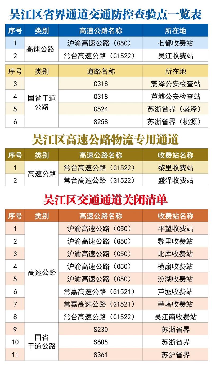 为认真贯彻国家、省、市、区关于做好疫情防控工作的总体部署,从严从紧抓好交通疫情防控,全力保障经济社会平稳有序,根据《苏州市疫情防控2022年第63号通告》要求,自2022年3月14日15时起,吴江区境内关闭11个高速公路及国省干道公路交通通道,设立8个高速公路及国省干道公路交通防控查验点,其中物流通道2个,迅速由“防外溢、防扩散”转为“防输入”。