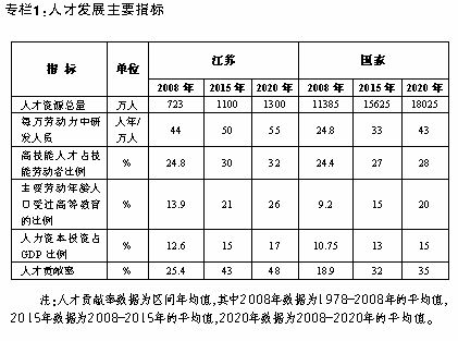 到2015年,区域创新能力继续走在全国前列,率先建成人才强省。到2020年,把江苏建成优秀人才集聚高地,人才发展的主要指标达到国际先进水平,具体指标如下: